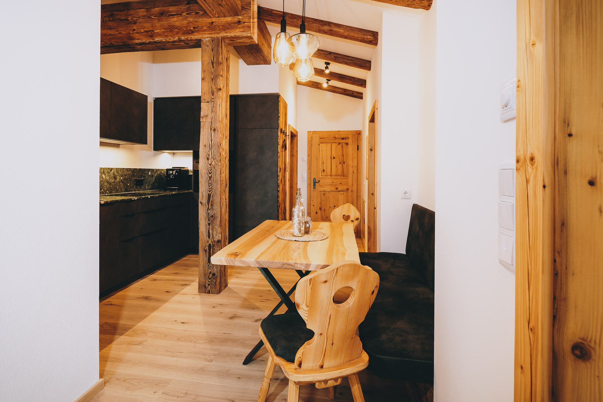 Unsere Ferienwohnungen wurden mit viel Liebe zum Detail und einem starken Fokus auf Nachhaltigkeit errichtet. Der gesamte Holzbau wurde in Eigenleistung gefertigt, und das verwendete Bauholz stammt aus unserem eigenen Wald. Auch in der Ausstattung setzen wir auf Regionalität und Qualität: